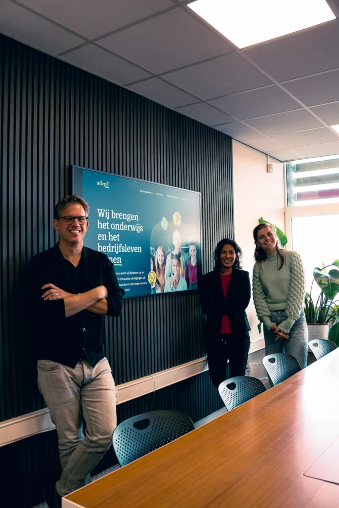 Van links naar rechts: Wouter van Dijk (Oprichter AdoptIDee), Lusanne Tehupuring (Bestuurslid Digifonds Noord) en Willeke Hoekstra (Projectleider AdoptIDee).